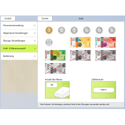 Eine Vielzahl an Einstellungsmöglichkeiten erlaubt es, die App an die Kenntnisse der übenden Person anzupassen. So kann beispielsweise bestimmt werden, welche Münzen und Geldscheine in den Übungen Verwendung finden sollen. Außerdem ist es möglich eigene Waren für die Übungen hinzuzufügen.